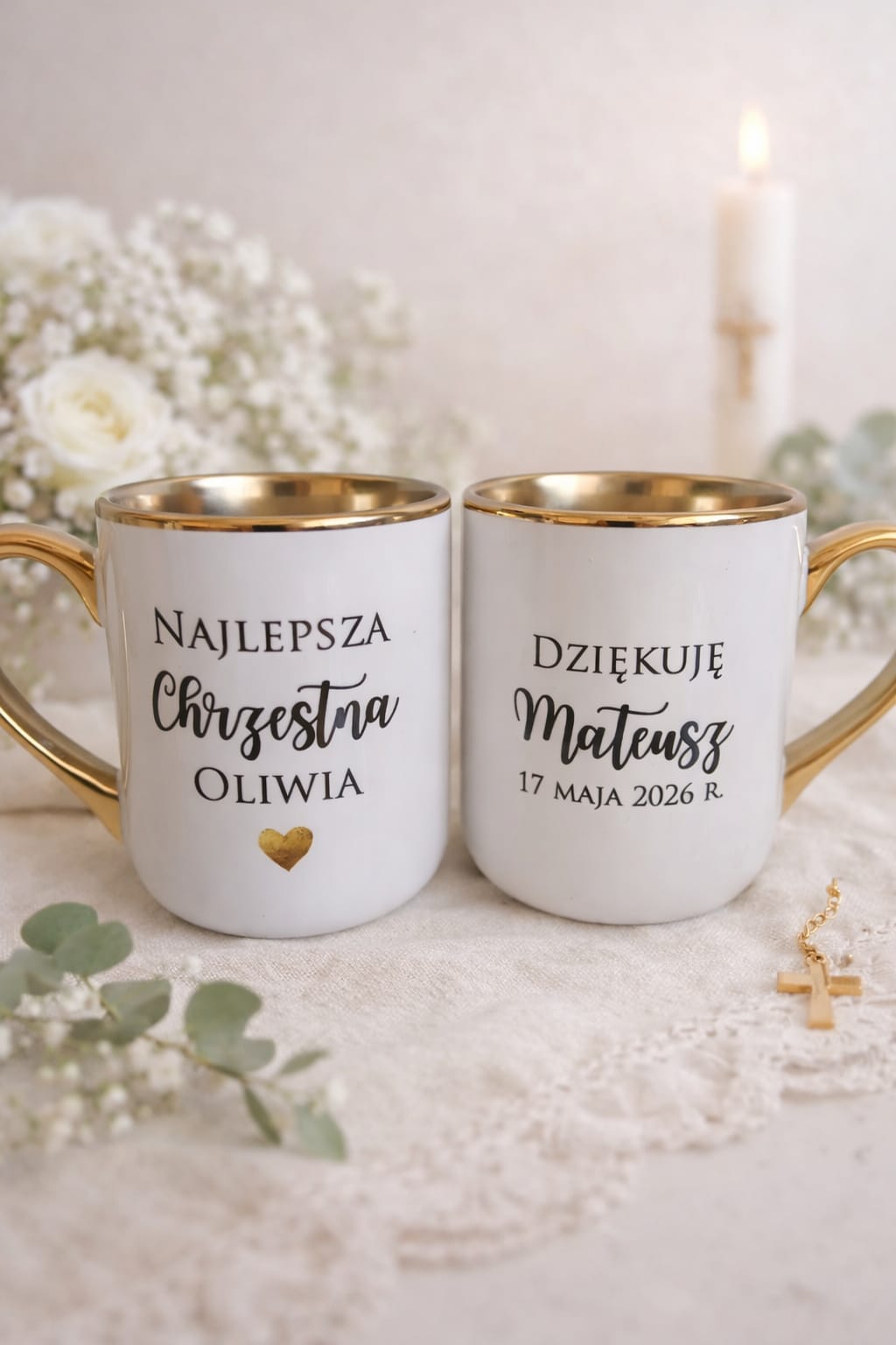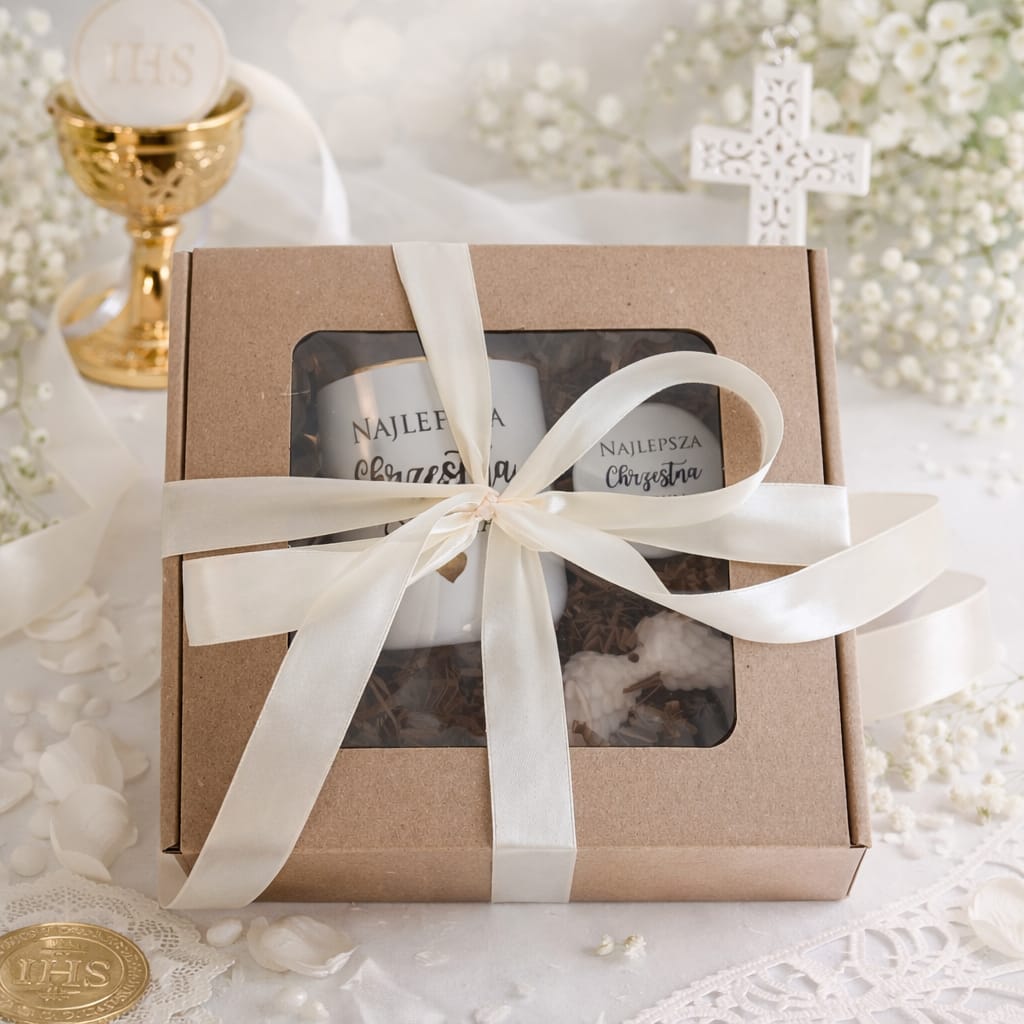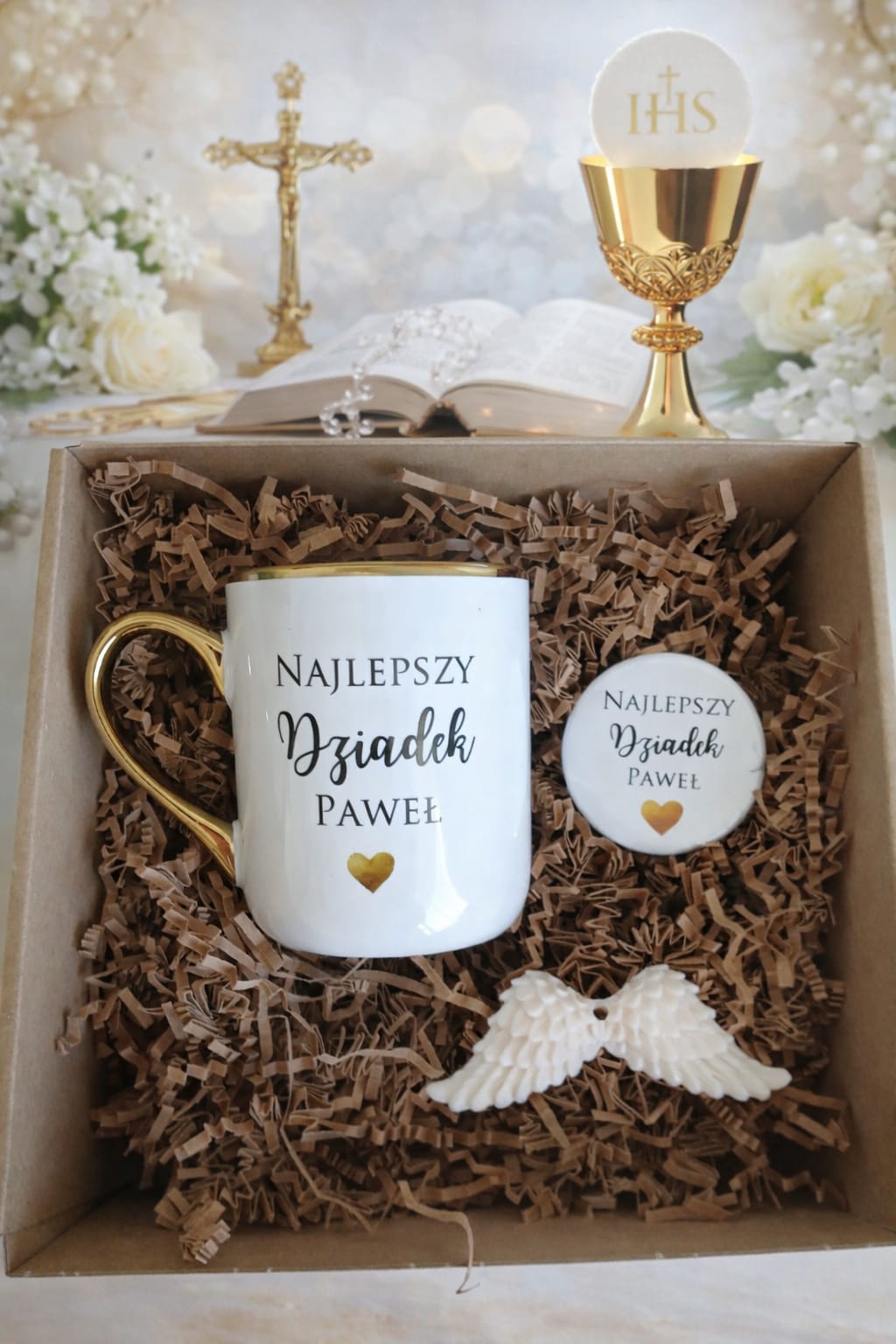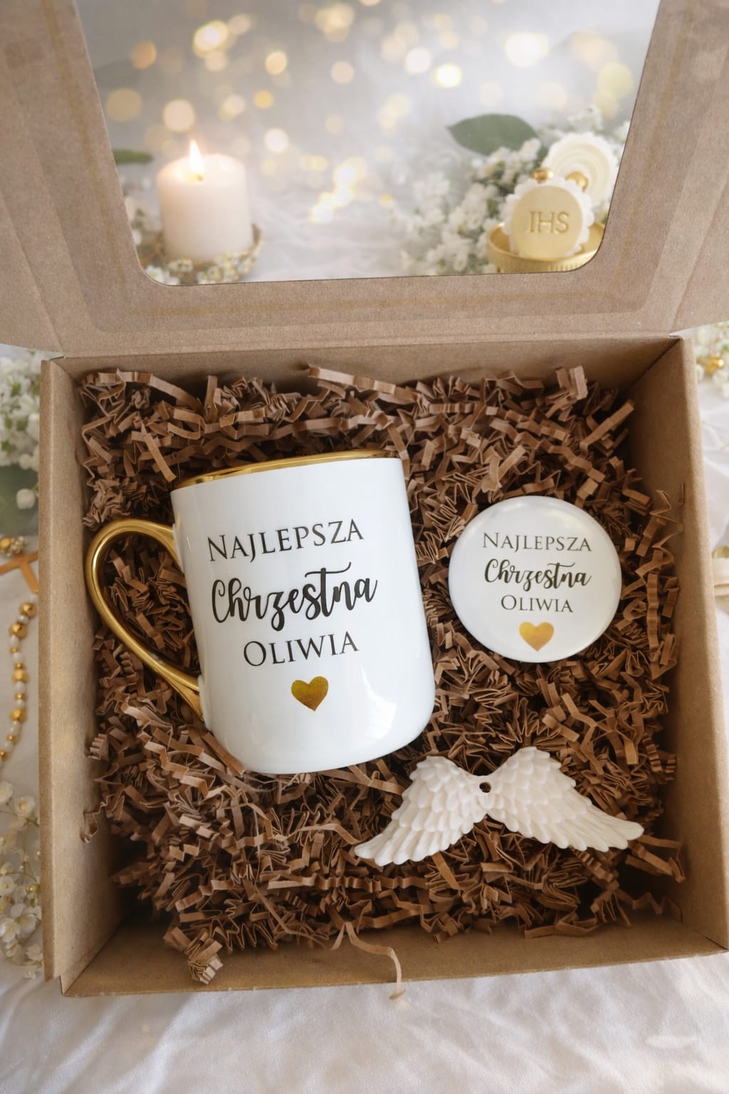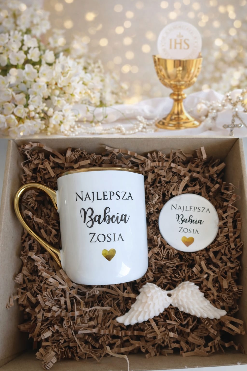 Box prezentowy personalizowany Komunia Chrzest Ślub kubek złocony 330 ml + magnes + mydełko anioł prezent dla chrzestnej chrzestnego babci dziadka