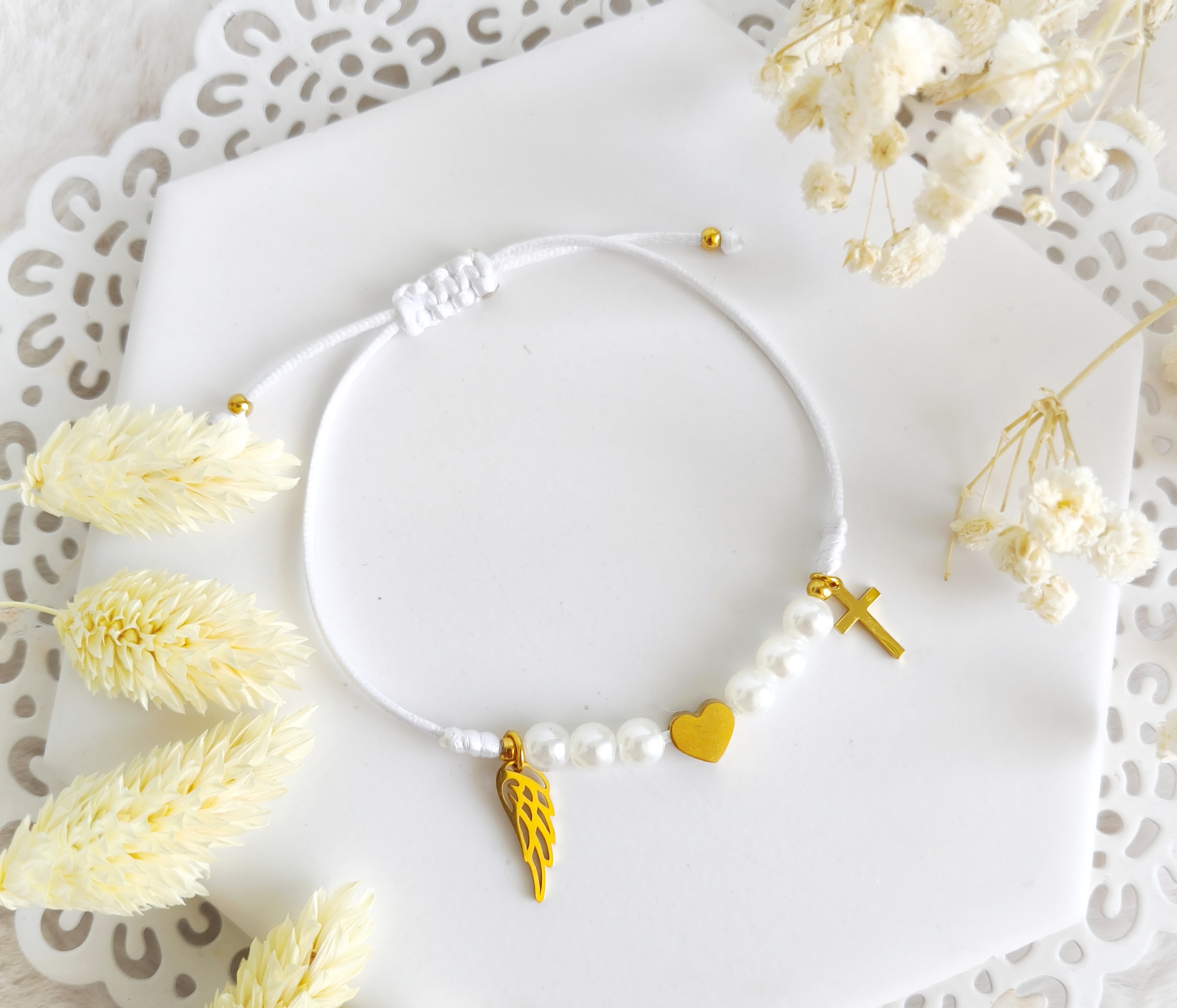 Bransoletka na rękę dla dziecka Pamiątka I Komunii Świętek aniołek i krzyżyk biała wzór 1 perełki