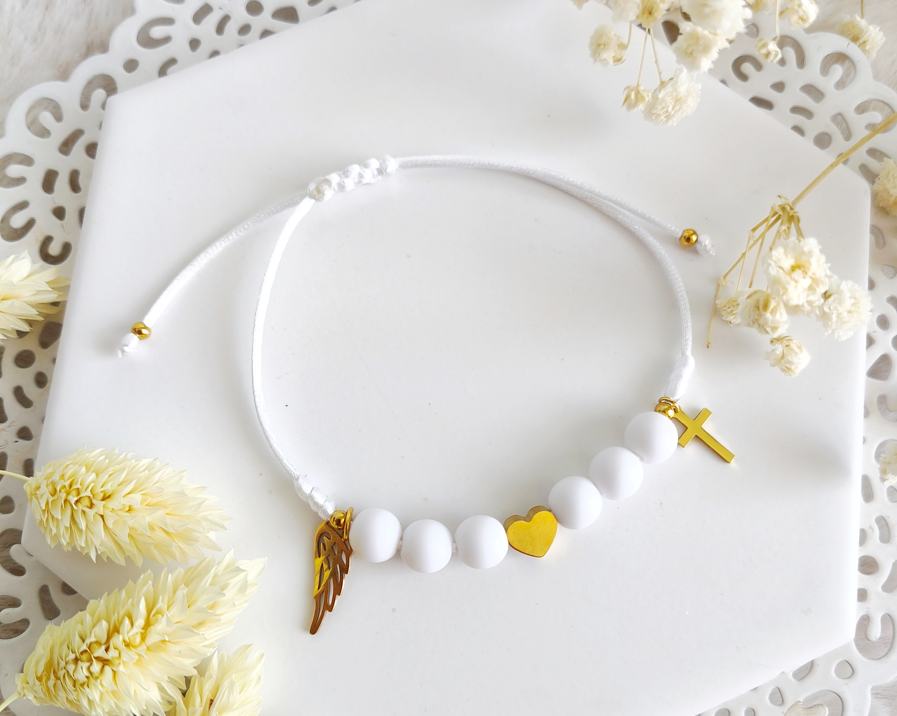 Bransoletka na rękę dla dziecka Pamiątka I Komunii Świętek aniołek i krzyżyk biała wzór 2 białe koraliki
