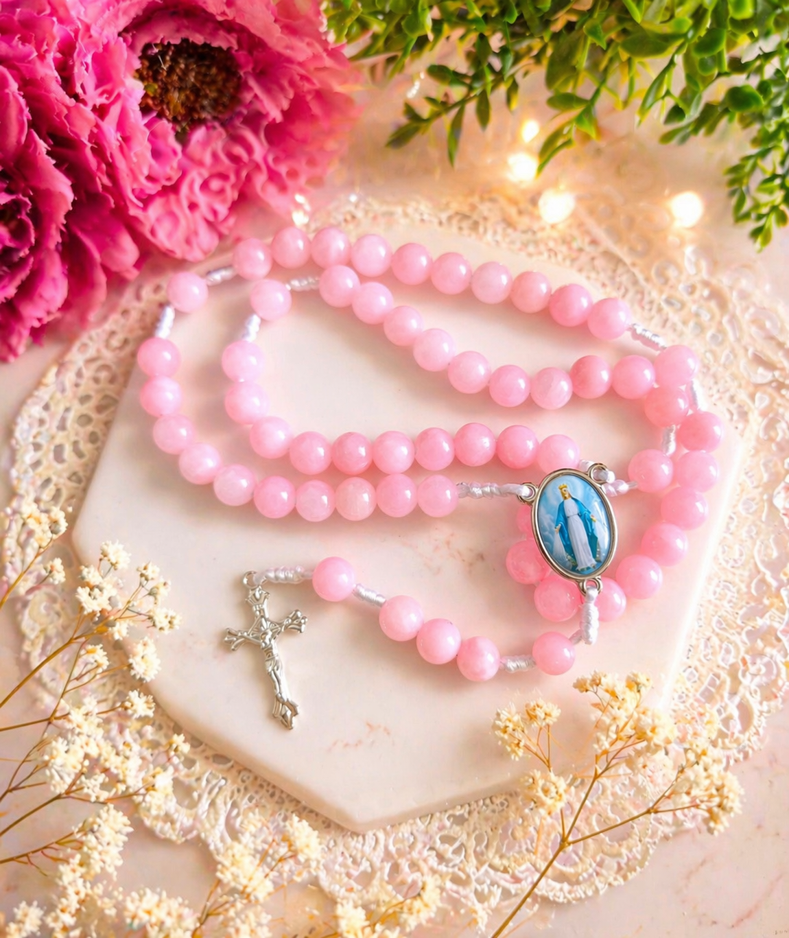 Różaniec tradycyjny różowy Jadeit Maryja niepokalana