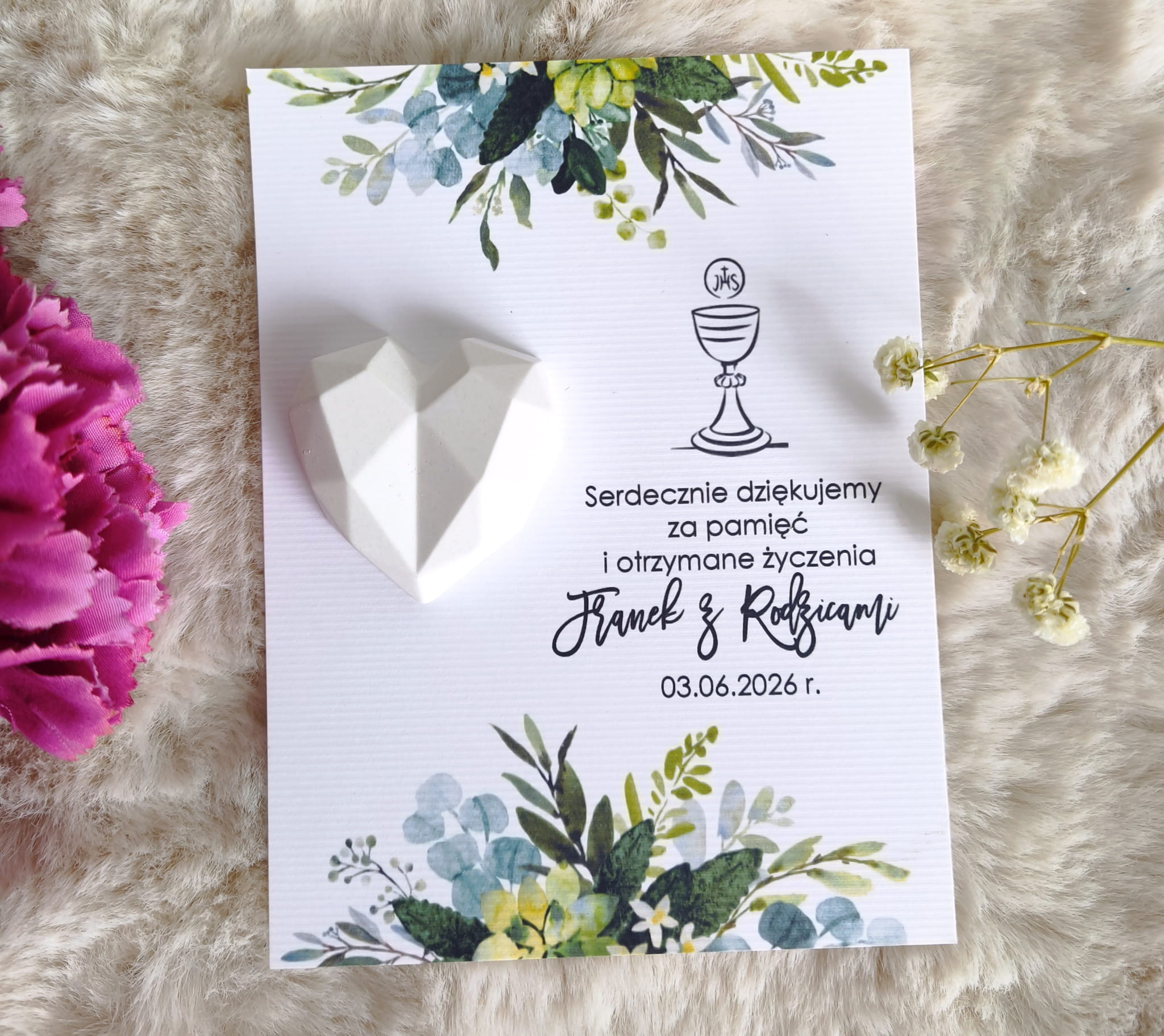 Serce geometryczne małe gipsowe podziękowanie na Komunię, chrzest, ślub, urodziny białe